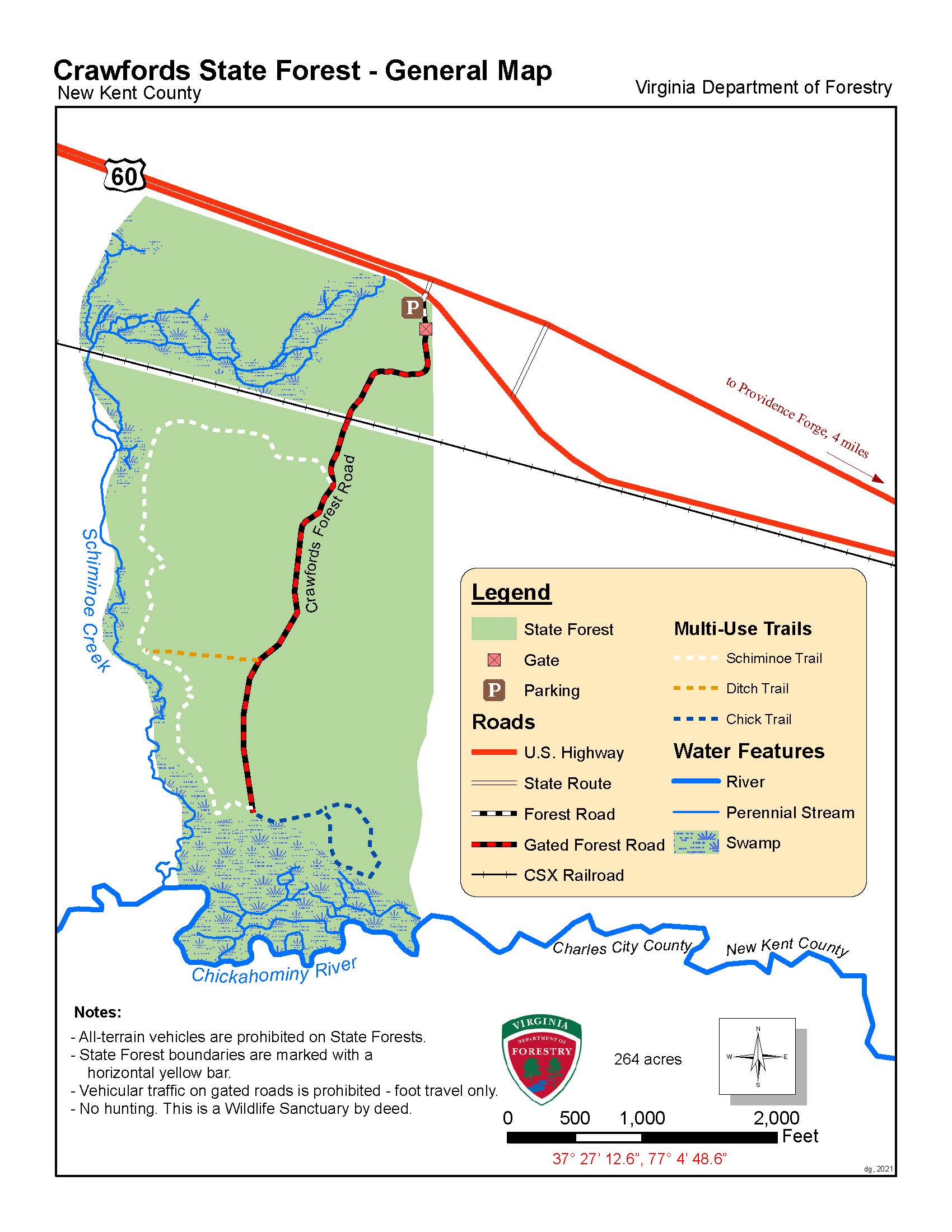 With forest types ranging from the cypress swamps along the river to pines and upland hardwoods stretching across 264 acres, Crawfords State Forest serves a wide variety of uses. This state forest produces timber, provides wildlife habitat, and is used for research and demonstration, water quality protection, and recreation. Permitted recreation activities for visitors to Crawfords State Forest are hiking and mountain biking. Mountain biking will require a state forest use permit (more information on state forest use permits can be found here: State Forest Use Permit). Access to the trailhead for 1.5 miles of forest trails and 0.8 miles of forest road can be reached on the south side of Route 60 / Pocahontas Trail, 1.75 miles west of Providence Forge. A small grass parking lot provides space for vehicles, however no other facilities are available so plan to spend the day in the woods and leave-no-trace if you go!