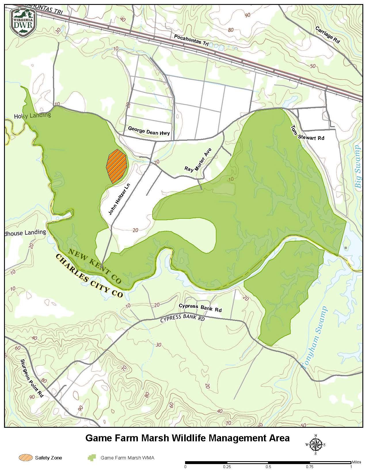 Game Farm Marsh is a 429 acre wetland accessible only by boat from commercial ramps on Chickahominy Lake. It is located east of Richmond on U.S. Route 60, approximately halfway between Providence Forge and Walkers Dam, on the Chickahominy River.